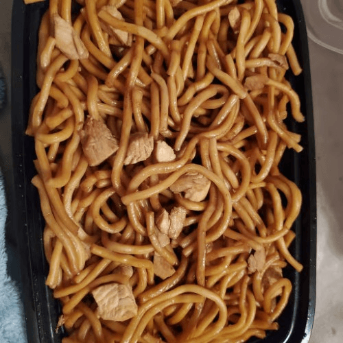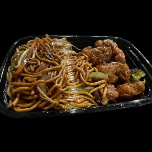 鸡炒面. Sauteed mix vegetable and chicken with light white sauce, with crunchy noodle chips on side
