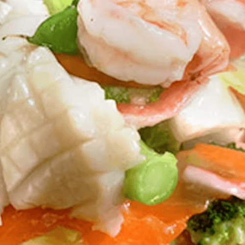 海鲜大会. Shrimp, scallops and calamari with vegetables in a light sauce