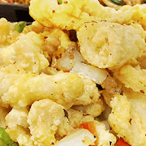 虾炒面. Sauteed mix vegetable and shrimp with light white sauce, with crunchy noodle chips on side